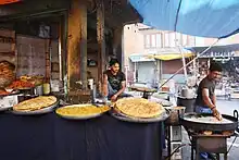 Kashmiris consume meat voraciously.[11][12] They share a love for lamb; the love a Kashmiri has for meat is unparalleled.[13][12] A good Kashmiri would not touch frozen meat, they feel it is not suited for the local cuisine.[14] They are, per capita, the highest mutton consumers in the subcontinent.[13] According to official data, around 2.2 million sheep are slaughtered in Kashmir every year on an average adding up to 21,000 tonnes annual meat consumption in the region.[15] Kashmiri Pandits are all Saraswat Brahmins, and hence avid meat-eaters.[16] The amount of mutton that is generally required to be bought for a Kashmiri Pandit wedding feast is 650 gm per head (not considering chicken).[17] Kashmiri Muslims prefer goat, especially young, while Kashmiri Pandits choose lamb.[18] Meat is called Neni by Pandits and Maaz by Muslims in Kashmir.[19] Asafoetida is mixed with yoghurt by Pandits and shallot mixed with garlic by Muslims.[5] In a majority of Kashmiri Pandit and Muslim cooking, bread is not part of the meal; it's always rice at lunch or dinner.[20] Bread is only eaten with tea in the morning or evening.[20] They may be bought from neighbourhood bakeries (qandurwan).[10]