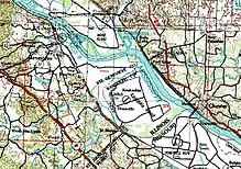 Most of the town was destroyed in April 1881 by flooding, as the Mississippi River shifted eastward to a new channel, taking over the lower 10 mi (16 km) of the Kaskaskia River. This resulted from deforestation of the river banks during the 19th century, due to crews taking wood for fuel to feed the steamboat and railroad traffic. The river now passes east rather than west of the town. The state boundary line, however, remained in its original location. Accordingly, if the Mississippi River is considered to be a break in physical continuity, Kaskaskia is an exclave of Illinois, lying west of the Mississippi and accessible only from Missouri. A small bridge crosses the old riverbed, now a creek that is sometimes filled with water during flood season.
