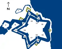 The five bastions are named as follows: The King's Bastion (Danish: Kongens Bastion), The Queen's Bastion (Danish: Dronningens Bastion), The Count's Bastion (Danish: Grevens Bastion), the Princess's Bastion (Danish: Prinsessens Bastion) and the Prince's Bastion (Danish: Prinsens Bastion).