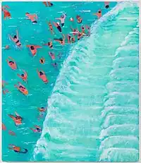 Bradford's later work (e.g., her "Fear of Waves" exhibition, 2016) has evolved toward larger, more vibrant work, that Yau writes "transform[s] the whimsical into the catastrophic, its polar opposite, without losing [its] offhand humor."[63][64] Often painted in water-soluble acrylic—ideal for mimicking the effects of water in images of swimmers, bathers and surfers—these paintings take more formal risks, with complex compositions of multiple figures and divided grounds of otherworldly, nocturnal planetary-oceanic environments.[65][64][66][63]