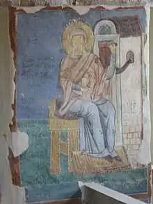 On the opposite apse (a sacristy), John the Baptist’s lifeline is shown. The story is finished with the scenes of his martyrdom and the three findings of his head. Some part of the scene showing Herod's feast is preserved, and the figure of seated Herodias while presented the severed head of the Prophet. Below, one of the 3 findings of the head is shown - the picture of a digging boy's head is preserved. The saint deacons are painted on the entrance arc of the apse.