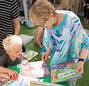 Brodsky has traveled to schools around New England as a storyteller and writer-in-residence. In 2015, she was sponsored by the Children's Literacy Foundation's Year of the Book grant, which provided free books to schoolchildren at her readings. She kicked off the program at Freedom Elementary School's "Read Across America" event.[33][116] As part of that same program, Brodsky spoke to the Valley View Community School in Farmington, New Hampshire.[32] She was the writer-in-residence at Pierce Elementary School in Bennington, New Hampshire,[1] and the Harold Martin School in Hopkinton, New Hampshire.[2] She has visited events for home-schooled students in Keene, New Hampshire.[117] The Derry Village School Cultural Arts Committee, in Derry, New Hampshire, hosted Brodsky at the Festival of Children's Authors and Illustrators in 2009.[118]