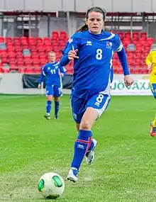 ![]() Jónsdóttir playing an international friendly against Sweden at Myresjöhus Arena in Växjö, 6 April 2013 | |||