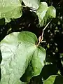 Kawakawa leaves are about 5–10 cm long by 6–12 cm wide; they are opposite to each other, broadly rounded with a short drawn-out tip and are heart-shaped at their bases. The leaves are deep green in colour if growing in the forest, but may be yellowish-green in more open situations.