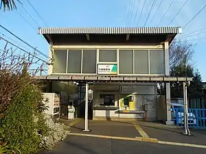 The station building and entrance is located on the south side of the tracks, with direct access to the up (Shitte-bound) platform 1. The down (Hama-Kawasaki-bound) platform 2 is accessed via an underpass.[1] The station is staffed with simple Suica touch points at the entrance rather than ticket barriers.[1] The station is staffed.