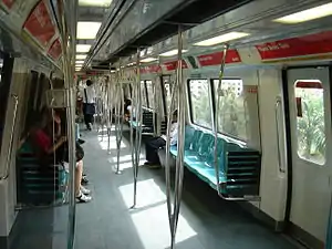 All cars have been retrofitted with 6 LCD Displays per car and all except trainset 347/348 which features VPIS (Visual Passenger Information System) displays from July 2001 to September 2009. These used to show rail travel information, commercials and movie trailers. The C751B is also the first train to have wheelchair space, with the retrofitting of the elevators in the MRT stations began in 2000. The interior design was also improved; the seats were now 48 cm wide - about 5 cm wider than on previous train types. The STARIS version 2.0 was piloted on train car 3322 in 2010, but it was uninstalled in 2016 as it was not compatible with the updated STARIS displays for C151B and C151C trains.