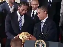 During his sophomore season, Leonard averaged 15.7 points and 10.4 rebounds per contest[6] as the Aztecs finished with a 34–3 record and won back-to-back conference tournament championships.[10] Led by Leonard, San Diego State once again made the NCAA tournament.[11] This time the Aztecs advanced to the Sweet 16, but then they lost to eventual national champions, Connecticut.[12] Leonard was named to the Second Team All-America and left San Diego State to enter the 2011 NBA draft.
