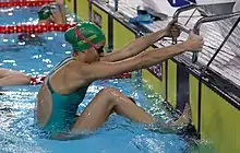 On day two, McKeown won the gold medal in the 100 metre backstroke with a personal best time of 55.49 seconds.[20][21] The morning of day three, she ranked tenth in the preliminaries of the 50 metre backstroke with a time of 26.24 seconds and advanced to the semifinals.[22] In the evening semifinals, she placed ninth with a time of 26.09 seconds.[23] Two days later, she swam the backstroke portion of the 4×50 metre medley relay in the preliminaries in a time of 26.42 seconds, helping qualify the relay to the final ranking first in an Oceanian and Australian record time of 1:44.78.[24] When the finals relay placed first in a time of 1:42.35, she won a gold medal for her efforts in the preliminaries.[25]