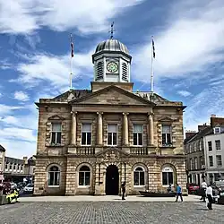 The foundation stone for the new building was laid by the 5th Duke of Roxburghe on 20 March 1816.[6] It was designed in the neoclassical style, built in ashlar stone and was completed later in the year.[1][7] The design involved a symmetrical main frontage with five bays facing onto The Square; the ground floor was originally open, so that markets could be held, with an assembly room on the first floor.[1] On the first floor elevation, there was an Ionic order portico which slightly projected forward and was surmounted by an entablature and a modillioned pediment and, at roof level, there was a balustrade and large octagonal cupola with a dome.[1] A clock, donated by a London-based clockmaker, Alexander Purvis, was added to the cupola in 1841.[5][8] In the mid-19th century there was a daily market for "fish, flesh and cabbage".[9]