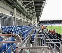 Opposite the Kenilworth Stand is the Oak Road End, which bears an electronic scoreboard on its roof and can seat a maximum of 1,800 fans.[33][16] Originally a home section, the Oak Road End was turned into a stand for away fans only at the start of the 1991–92 season. Early in the 2013–14 season, the Oak Road End was re-opened for home supporters for fixtures where visiting support was predicted to be especially low, with the section for away fans moved to A Block of the Kenilworth Stand for these games.[34] Later that season, it was announced that the stand was available for shared use between both home and away supporters, increasing Kenilworth Road's home capacity by 15%. The Oak Road End has an entrance that is often considered unusual, requiring spectators to go through an entrance built into the row of houses and up stairs to the stand.[9][36]
