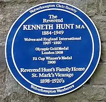 A Blue plaque was erected in Hunt's honour on 28 October 2004 at St Mark's Church, Chapel Ash[6] by Wolverhampton Civic Society and Wolverhampton Wanderers.[7]