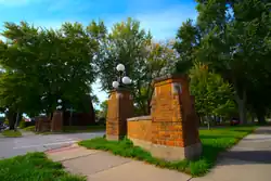 The district features three stylized entrances that were part of the original Kensington Park plan. At East State street, the entrance to Kensington boulevard is flanked by square brick columns with stone tops connected to brick walls that rise to the midpoint of the columns. The columns are corbelled at the midpoint, from whence they are battered upwards. The stone walls are capped with brick corbels to present a contrast to the stone-capped brick columns. A further column is placed on the opposite side of each sidewalk to make a matching pair. Entrance structures matching this set are placed at the south end of the first phase, on the north side of the intersection of Kensington and Lake Avenue, with the addition of globe light fixtures. On the south side of this intersection, a similar structure forms the entrance to the south phase, except it is made entirely of stone the top. Like its counterpart across Lake Avenue, it also features globe lighting.[3]: 16–17