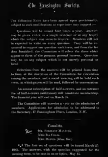 In the interest of maximum efficiency and discussion quality, each member submitted a discussion question before meetings. Charlotte Manning, Isa Craig, and Emily Davies selected the three questions of "greatest interest" to the group and presented them. The members exchanged response papers and discussed them at the following meeting.[5] By giving all of its members the opportunity to participate in constructive debate and discussion, the society allowed competent and educated women to articulate their thoughts for further expansion of the suffrage and more egalitarian political movements. The society charged the substantial sum of two shillings and sixpence annually and the same sum for each meeting. Manning's house was used because it could accommodate the number of women who attended. Some of the women were confident, where as others used the society as a place where they could discuss a wide range of subjects privately. The opinions expressed at the meetings were not recorded but the subjects chosen included the obedience of daughters, whether boys and girls should be taught the same subjects and whether women could aspire to be members of parliament or magistrates should they ever be given the vote.[6]