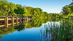 The Grand River runs through the county. On its west bank are burial mounds, remnants of the Hopewell Indians who lived there.[5] The river valley was an important center for the fur trade in the early 19th century. After the War of 1812, Rix Robinson and Louis Campau were the earliest traders in the area.[6] In 1826, Campau established a trading post in Grand Rapids. In 1831, he bought land and platted the town. Campau is considered the town's "father".[7][8][9] One year later, government surveyor Lucius Lyon purchased land north of Campau's property. Campau surveyed and platted the village following Native American trails[8] and Lyon had platted his property in an English grid format, which meant there were two adjoining villages, with different platting formats.[8] Campau later merged the villages under the name of Grand Rapids.[8]