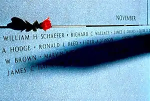 Located in Frankfort, Kentucky, overlooking the state capital, Kentucky Vietnam Veterans Memorial contains the names of 1,108 Kentuckians killed in the Vietnam War. The memorial is in the form of a sundial with the names placed so that the tip of the gnomon's shadow touches each man's name on the date of his death, thus giving each fallen warrior his own personal memorial day.[1]