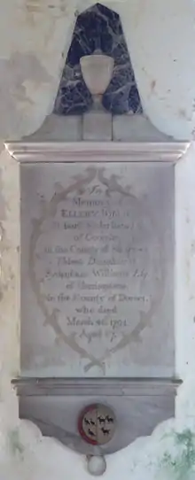In the time of the Devon historian Polwhele (1760–1838), Priory was the seat of St Barbe Sydenham[23] (died 1757),[24] He was the only son of Humphrey Sydenham and was the possessor of Combe in 1791.[25] He married his cousin Ellery Williams (1727–1794), eldest daughter of Sydenham Williams of Herringston House[26][27] in the parish of Winterborne Herringston in Dorset, whose mural monument survives in Broadhembury Church, inscribed as follows:
