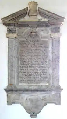 Humphrey Sydenham (1694–1757), "The Learned", of Combe and Nutcombe,[14] Devon, eldest son and heir of Humphrey Sydenham (1672–1710), was MP for Exeter 1741–1754.[15] His mural monument survives in All Saints' Church, Dulverton.[lower-alpha 1] He was a lawyer trained at the Inner Temple. He married Grace Hill, 2nd daughter and co-heiress of Richard Hill (1655–1737) of Kerswell Priory (who is mentioned on her father's mural monument in Broadhembury Church[16]) (a junior branch of Hill of Hill's Court[17] in Shropshire[18]), by whom he had children 1 son and 3 daughters.[19] He was ruined by the South Sea Bubble of 1720, in which he lost £20,000.[20] His financial situation was restored by a large inheritance from his great-great-uncle Sir John St Barbe, 1st Baronet (died 1723), MP, of Broadlands in Hampshire. In the chancel of Ashington Church, Somerset, is a monument of grey and white marble, inscribed:[21]