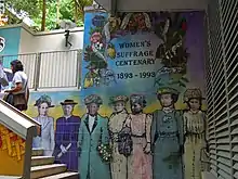 In 1993, in honour of the centenary of women's suffrage in New Zealand, a painted 2000–tile memorial and waterfall dedicated to Auckland's and New Zealand women's suffrage movement was installed in the stairway.[1] The artist Claudia Pond Eyley and ceramicist Jan Morrison chose the Auckland-based suffragists depicted in the memorial. The women featured in the lower and main section include (from left):