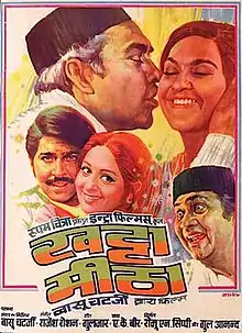 Khatta Meetha (English: Sweet and Sour) is a 1978 Hindi film directed by Basu Chatterjee. The film stars Ashok Kumar, Rakesh Roshan, Bindiya Goswami, Pearl Padamsee, Deven Verma, David Abraham Cheulkar, Ranjit Chowdhry, Preeti Ganguly, Pradeep Kumar and Iftekhar. The film's music is by Rajesh Roshan.[1] At the 26th Filmfare Awards, Deven Verma was nominated for Filmfare Award for Best Performance in a Comic Role for the film, but won it for Chor Ke Ghar Chor.[2] This was also the debut film of actor Ranjit Chowdhry, who later appeared in films like Basu Chatterjee's Baton Baton Mein (1979) and Hrishikesh Mukherjee's Khubsoorat (1980).