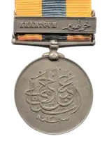 The Khedive's Sudan Medal was a campaign medal awarded by the Khedivate of Egypt to both Egyptian and British forces for service during the reconquest of the Sudan, the final part of the Mahdist War. Established 12 February 1897 by Khedive Abbas Hilmi Pasha, this medal was initially to commemorate the reconquest of the Dongola province in 1896.[1] It was subsequently authorised for later campaigns and actions until 1908. The medal was awarded with fifteen different clasps.[2]
