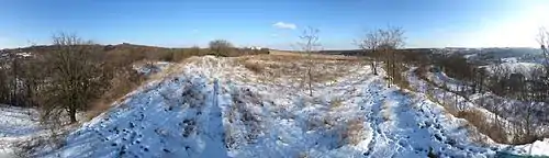 The hillfort adjoins the southern part of Kyiv, namely Feofaniya Park. It occupies a rhombic plateau 1000x700 m wide, bordered by valleys of the streams. All the plateau area, 31 ha, was surrounded with earth rampart, while the slope of the hill was fortified by a scarp with a berm and a moat beneath.[1] The rampart, scarp and berm are well preserved on the western and eastern edges, and remains of the moat are much less conspicuous now. It is supposed that the hillfort had 3 entrances: in the northern, eastern and southern part of the rampart.[2]