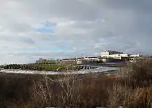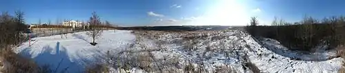 The building on the hillfort began in 2009. Initially its customer was unknown, and an information board on the building site announced construction of a new entrance to Feofaniya Park.[28] Gradually, a luxurious palace surrounded by terraces appeared there.[4][29] As of 2016, the northern part of the hillfort (one of the richest in remains of ancient buildings and enclosed with the highest rampart),[1] including its fortification, and the landscape of adjacent areas was demolished.[5] According to Yuri Kosiuk, "the building which is built is built in a chasm, and it has nothing to do with the hillfort".[4]