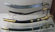 The Central Asian Turks and their offshoots began using curved cavalry swords beginning from the late Xiongnu period.[4] The earliest examples of curved, single edged Turkish swords can be found associated with the late Xiongnu and Kök-Turk empires.[5] These swords were made of pattern welded high carbon crucible steel, generally with long slightly curved blades with one sharp edge. A sharp back edge on the distal third of the blade known as yalman or yelman was introduced during this period.