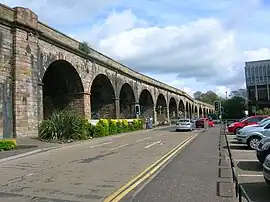 Kilmarnock railway viaduct, known locally as The Viaduct, is a railway viaduct crossing the town centre of Kilmarnock, and was constructed between 1843 and 1850. The bridge begins at Kilmarnock railway station and leads to destinations in England. It is a most distinctive feature of the town centre with 23 masonry arches and defines the northern boundary of the town centre. It was built in the 1840s to enable the Glasgow–Kilmarnock line to continue to Carlisle.[1]