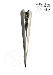 The kilt pin is a piece of jewellery that is usually worn on the lower corner of the outer apron of a kilt. Its function is to prevent the apron falling or blowing open, by adding weight to the outer apron and is commonly seen as a form of decoration.[1] It does not pin the outer apron to the inner fabric, which is a common misconception.