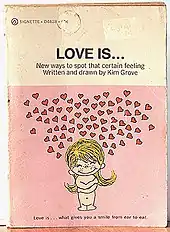 Casali's obituary published in The Times related that after she and Roberto became engaged, Casali took a job as a receptionist for a design company, "and made up little booklets of her winsome cartoons, which she sold for a dollar apiece. Word soon spread and the demand for Love is... escalated. Roberto recognised their commercial potential and showed them to an American journalist."[6] Although other sources differ regarding whether it was Roberto or Casali herself who first showed the cartoons to an acquaintance working for the Los Angeles Times, the newspaper picked them up for publication and published the first of the series on 5 January 1970, under the pen name "Kim".[2][10][12][13] The cartoon's release coincided with the wave of success of the novel Love Story (1970) by Erich Segal, and the subsequent movie of the same name starring Ali MacGraw as a girl dying of an incurable disease and Ryan O'Neal as the student who worshiped her. The film's slogan was "Love means never having to say you're sorry." Casali altered it into one of her most famous cartoons: "Love is... being able to say you're sorry."[14]