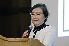 As co-chair of the faculty council, Kim was one of the leaders of protests against Choi Kyung-hee, who resigned as president of Ewha in October 2016 over corruption charges and was later sentenced to imprisonment.[4][5] In early 2017, Kim was elected as Choi's replacement as university president, winning the first-ever direct election for the post. In a ballot of the university's students, faculty, and alumni, she won 33.9 percent of the first-round vote and 57.3 percent in the final round.[6] The election process was somewhat controversial, as there was initially an age limit of 61 for candidates; some commentators accused the university board of setting this limit specifically to exclude Kim, who was 62.[7] Kim took office on 31 May 2017, to a term expiring on 28 February 2021.[4] During her election campaign, she promised to "return Ewha to its original state and restore its honor".[8]