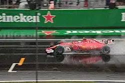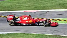 Räikkönen began the season by qualifying 17th for the Australian Grand Prix after making a mistake on his last flying lap. However, he recovered his weekend during the race the next day, as he made a good start to move up to twelfth, before making it into the top ten. He took three places on the last lap of the race, to finish in seventh place.[70] In the dry qualifying session for the Malaysian Grand Prix Räikkönen qualified in fifth place. He started the race from 10th place because of an unscheduled gearbox change. In the race he had the opportunity to try Pirelli's wet-weather tyres for the first time. He finished the race in fifth despite being inexperienced with Pirelli's wet-weather tyres compared to most of the other drivers. At the Chinese Grand Prix he was 14th after running second before being overtaken by 10 cars in the space of one lap, due to a mistake in tyre strategy, expecting the Pirelli tyres to last longer in the last stint. At the Bahrain Grand Prix he finished second starting from 11th position on the grid. It was his first podium and his best finish of this comeback. Three weeks later, Räikkönen finished third at the Spanish Grand Prix, after having qualified in fifth place, which had been promoted to fourth as a result of a penalty given to Lewis Hamilton. In the Monaco Grand Prix Räikkönen qualified in eighth but finished one place lower in ninth place. For the Canadian Grand Prix Räikkönen again had a bad qualifying session finishing 12th. He was able to finish eighth in the race taking, as he stated, "important championship points". In the European Grand Prix at the Valencia Street Circuit he finished second behind Fernando Alonso.[71] In the British Grand Prix he finished fifth, after having qualified in sixth place. During qualifying for the German Grand Prix, Räikkönen had good pace in Q1 with the harder set of tyres and was looking good for a potential shot at a higher grid place. At the start of Q2 the rain was already heavy meaning that Räikkönen lost the advantage he had in dry conditions. In the wet Q3 session he qualified in 10th place. Good pace in dry conditions from the qualifying session was proven in the race as Räikkönen succeeded to finish fourth, and eventually gaining the last podium spot after Sebastian Vettel was penalised for an illegal overtaking manoeuvre. For the Hungarian Grand Prix Räikkönen qualified fifth. He lost fifth place at the start to Alonso due to a KERS issue on his E20 car. He succeeded in gaining a position over Alonso during the first round of pit-stops, and later did the same to Button and Vettel during the second round. He finished the race in second place, just one second behind the race winner Hamilton.