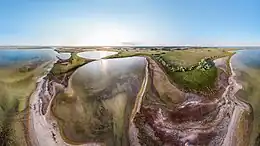 The Kinburn Spit (Ukrainian: Кінбурнська коса, romanized: Kinbúrnska kosá) is a spit in Mykolaiv Raion, Mykolaiv Oblast, Ukraine.[1] Its only land access is through Kherson Oblast. It occupies the westernmost part of the Kinburn Peninsula, stretching west into the Black Sea between the Dnieper-Bug estuary to the north and the Yahorlyk Bay to the south. It is approximately 10 kilometres (6.2 mi) long, with a width of about 1 kilometre (0.62 mi) at its base, narrowing to about 100 metres (330 ft) in its western half.