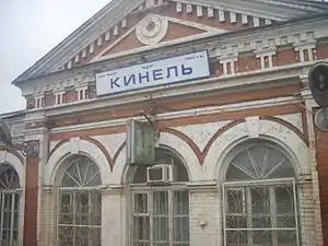 Kinel railway station was built in 1876 with the construction of Batraki (now Oktyabrsk) — Orenburg railway with the length of 507 versts (540.4 km). Kinel station was laid at 155 versts of the line. A branch from Kinel to Ufa was planned initially. The station was named Charykovskaya, after the landowner V. Charykov, on whose lands new station was under construction. Construction began in May 1874. The first train from Orenburg arrived to Kinel in October 1876 and from Syzran in January 1977. The station consist four tracks, several spur tracks, two low platforms, small wooden station building, repair shops and water tower. After Charykov's death, his son declared unethical use of noble family names in public places, and the station was renamed Kinel.[2]