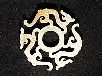 The style and usage of bronze artefacts underwent a drastic change by the time King Cuo died in the fourteenth year of his reign. Among the changes was a de-emphasis on ritual bronze vessels and a new focus on luxury bronze objects. A bronze vessel from the tomb recorded a previously unrecorded invasion of Yan during that year that may have contributed to the change in style; some archaeologists believe that the new techniques may have been introduced by Yan artisans or copied from looted Yan bronzes.[1] The new technique included the use of inlaid silver and gold onto bronze objects, often portraying mythical beasts.