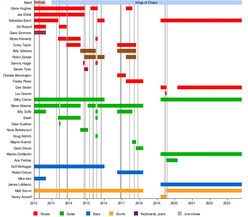 The band is not meant to have a permanent lineup, and has thus had its fair share of personnel changes. At its core, playing every show with both the Kings of Chaos and Rock N Roll All-Stars, were the former Guns N' Roses members, Matt Sorum, Duff McKagan, and Gilby Clarke. This changed in December 2016 when Kings of Chaos played its first show without McKagan and Clarke.