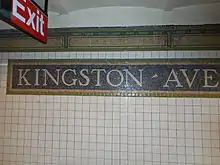 The platform extensions at either end have signs reading "KINGSTON AVE" in white sans serif lettering on a black border.[25] There is a vent chamber on the lower level.