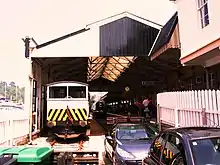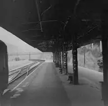 The southern end of the platform and tracks is covered by a rare wooden 100 feet (30 m)[1] train shed, with a more conventional canopy extending further along the platform. The entrance to the station opens onto the main platform within the train shed; trains stop further along the platform to the right to allow the locomotive to run around the train using the crossover at this end of the platform track. The bay platform does not have a locomotive release road and so is only used for occasional departures that have been shunted onto this line to free up the main platform for a second train.