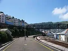 The old goods yard between the station and the waterfront is now a car park and boat storage; the long footbridge at the north end of the station is not connected to the platforms but instead carry a footpath from the main road across to the waterfront. Another car park at the north end of the station is on the site of the turntable and carriage sidings. A few sidings have been retained opposite the platform and alongside the line towards Britannia Crossing, the level crossing that leads down to the Dartmouth Higher Ferry and is the site of the railway's signalling centre.