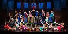 The musical's economic clout empowers a shift in the American cultural climate, engendering acceptance of cross-dressing and transgender individuals.[63] For example, on November 28, 2013, members of the cast performed the finale of the show in the nationally televised Macy's Thanksgiving Day Parade. Many viewers commented that, in their opinion, the performance was inappropriate for a family program.[64][65] The performance of August 26, 2015 marked the 1000th Broadway performance for the production.[66] The Broadway production closed on April 7, 2019 after 34 previews and 2,507 performances.[67]
