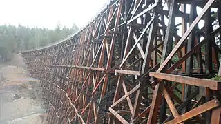 The bridge's dimensions measure 44 m (144 ft) high and 188 m (617 ft) long, making it the largest wooden trestle in the Commonwealth of Nations and one of the highest railway trestles in the world.[2] It was constructed out of old-growth Douglas fir timbers,[3] and has an unusual seven-degree curve.[4]