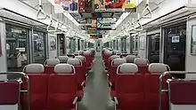 Perpendicular seating has long been provided on long-distance services on the Osaka and Nagoya lines.[1] In previous Kintetsu 2600 series trainsets and related counterparts, fixed perpendicular seats were a common feature on these services. However, passengers complained about their lack of comfort.[4]