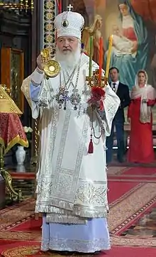 Kirill or Cyril (Russian: Кирилл, Church Slavonic: Ст҃ѣ́йшїй патрїа́рхъ кѷрі́ллъ, secular name Vladimir Mikhailovich Gundyayev, Russian: Владимир Михайлович Гундяев; born 20 November 1946) is a Russian Orthodox bishop. He became Patriarch of Moscow and all Rus' and Primate of the Russian Orthodox Church on 1 February 2009.