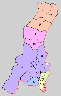 * yellow - areas formerly within the district borders during the early Meiji period