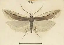 The wingspan is about 15 mm. The forewings are rather light brownish, darker towards base. There is a rather broad whitish costal streak nearly from the base to two-thirds, narrowed near the base, the posterior extremity suffused, with a slender suffused dark-grey streak on the costal edge from before the middle of the wing to two-thirds. The discal stigmata are rather elongate, dark fuscous, touching the lower edge of the whitish streak, the plical slightly marked or obsolete, somewhat before the first discal. There is some fuscous irroration (sprinkling) running from the second discal to beneath the apex and the costa posteriorly and termen are interruptedly lined fuscous. The hindwings are light grey.[2]