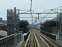 The station has two elevated side platforms, each capable of accommodating eight-car trains, with the station building underneath[1]
