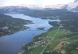 Knaplundsøya or Godøya is an island in Bodø Municipality in Nordland county, Norway. The 6.6-square-kilometre (2.5 sq mi) island lies just southeast of the town of Bodø, between the Saltfjorden and the Skjerstadfjorden. The island is connected to the mainland and to the neighboring island of Straumøya by the Norwegian County Road 17. The Saltstraumen strait and its famous maelstrom are located between Straumøya and Knaplundsøya. The island had 392 residents in 2016, mostly living on the north and west shores of the island.[1]