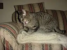 Kneading (also referred to as making biscuits[1] or baking) is a behavior frequently observed in domestic cats where, when a cat feels at ease, it may push out and pull in its front paws against a surface such as furniture or carpet, often alternating between right and left limbs. Each stroke is accompanied by a grasping motion of the claws as if the cat were kneading dough.