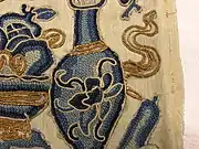 Knotted embroidery originated in ancient China; the oldest example of it dates from the Warring States period in the form a pair of silk shoes.[1] Knotted embroidery was popular in the Han dynasty and fine silk clothing were embellished with the Pekin knot in this period.[1] Knotted embroidery were also used on the mandarin square of the Ming and Qing court clothing of officials.[1] The Pekin knot is one of the two main types of Chinese embroidery stitches, with the other being the satin stitch.[5]