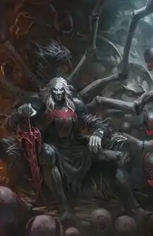 Knull possesses superhuman strength and durability.[37][38][39] He is depicted as an immortal being.[40][6] He is able to generate and manipulate eldritch darkness, as he can manifest darkness to create weapons and living creatures, whom he calls the "Living abyss."[41][42][43][44] He is able to forge different types symbiotes with various abilities, such as dragon-like symbiotes.[45][46] He can remotely influence and control the symbiotes he creates.[47] Knull is also a shapeshifter, being able to turn his human-like mouth into fanged jaws with an elongated tongue — a feature passed on to the symbiotes.[48] With his regenerative healing factor, Knull can recover quickly from injuries.[49] Knull also has the ability to fly.[50]